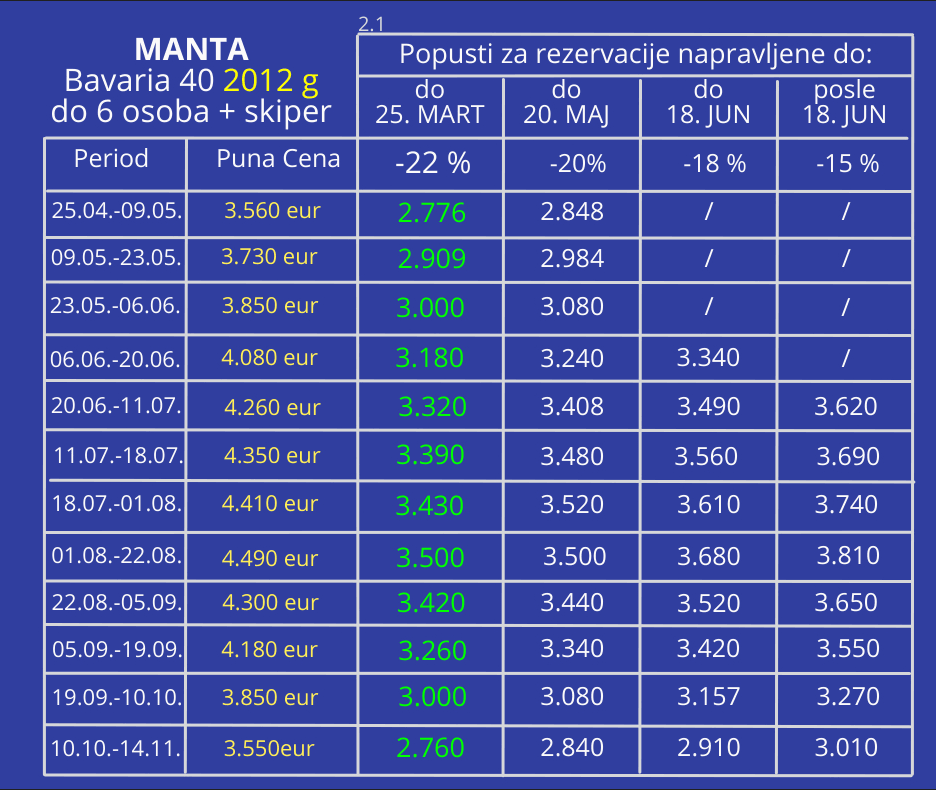 • Cena jedrenja je izražena ukupno za izabranu jedrilicu u izabranom periodu, nije moguće cenu deliti na broj osoba.