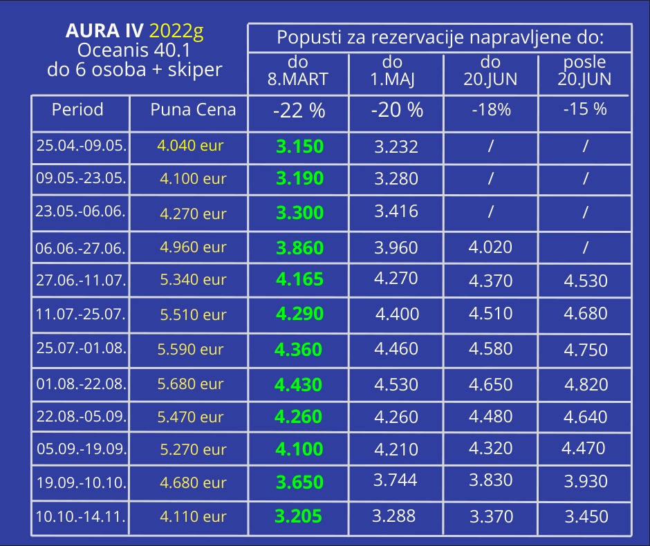 - 30% cene jedrenje najmanje 30 dana pre početka jedrenja